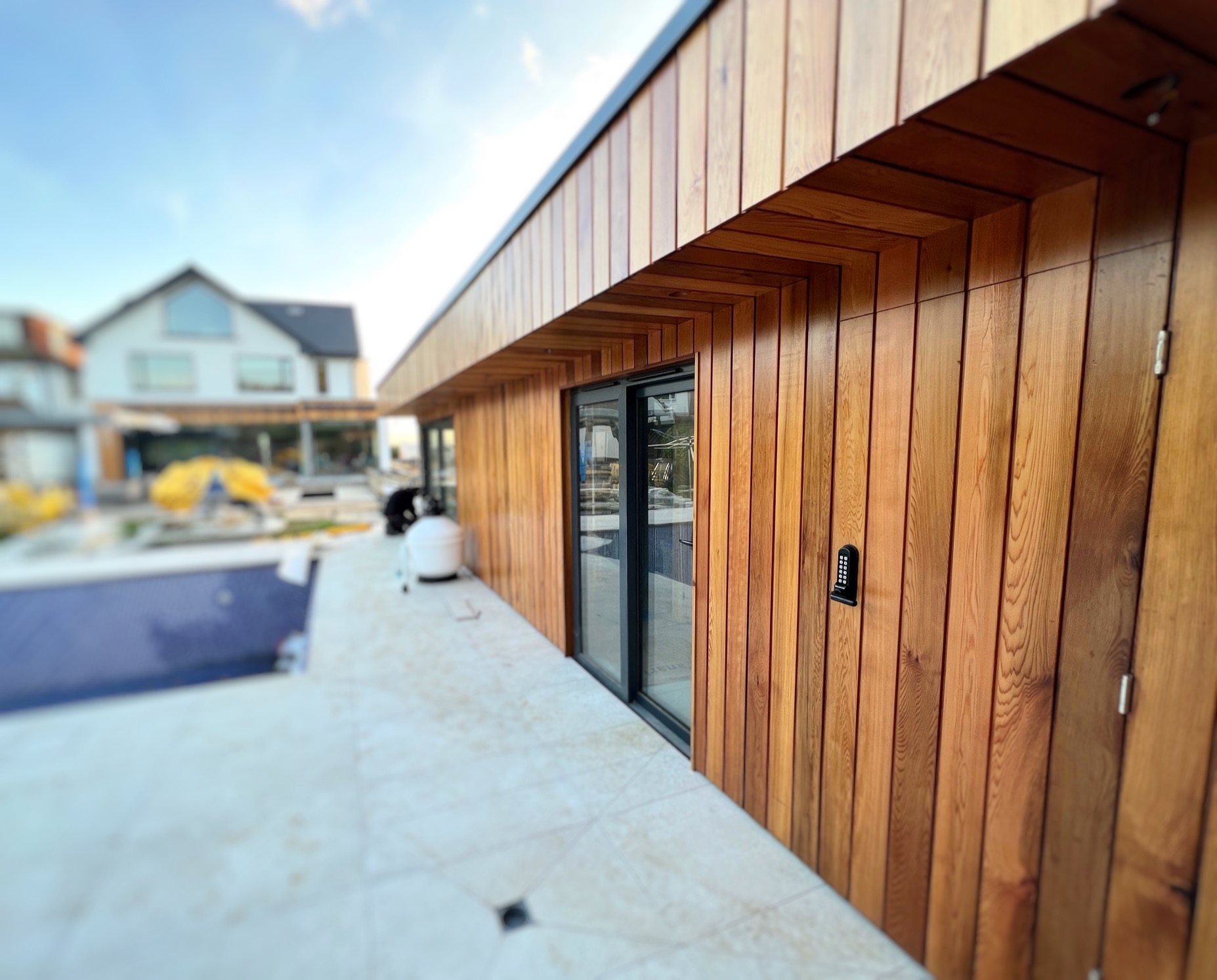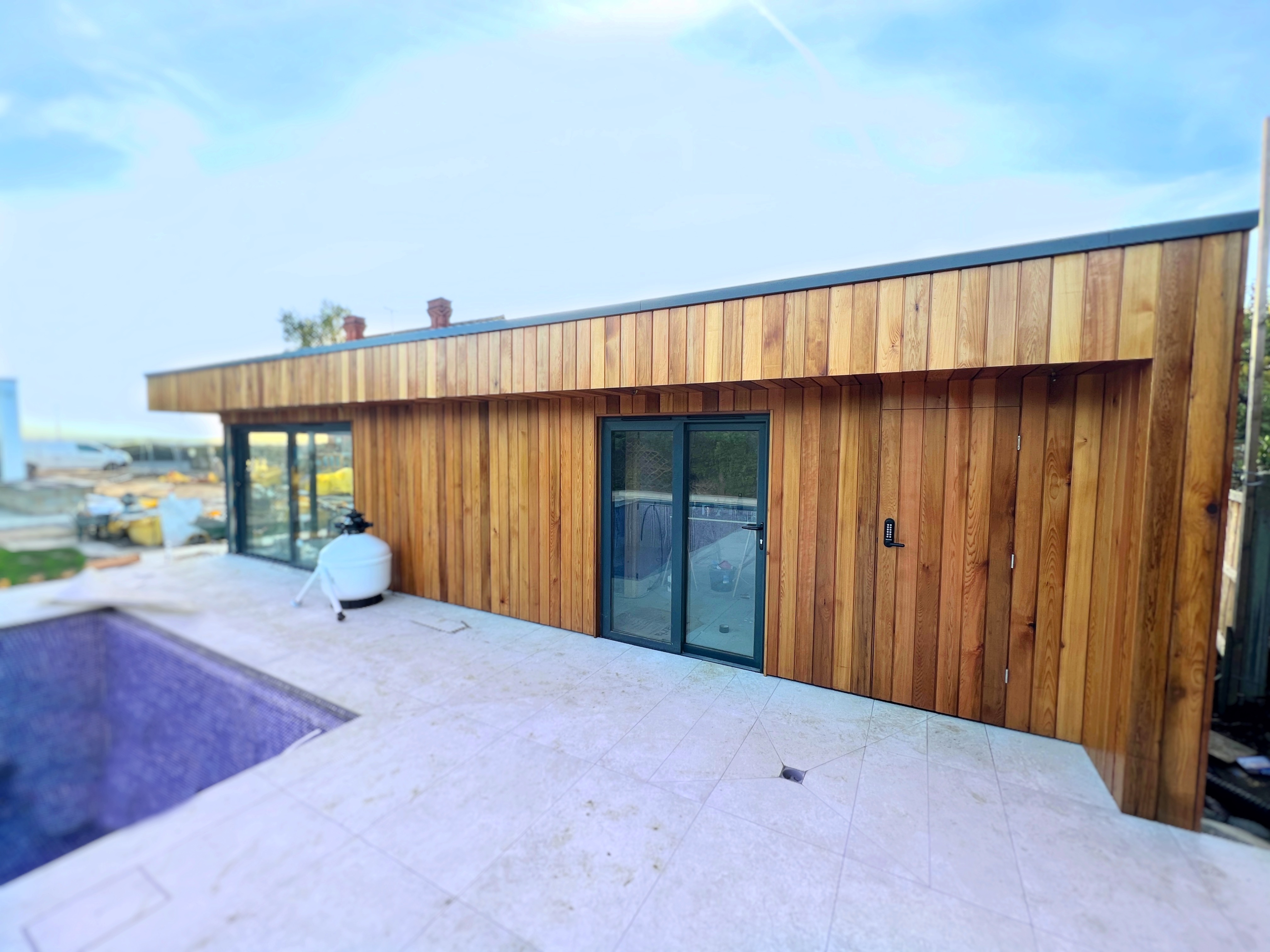 A 30 square meter premium grade Pool House by InFrame Garden Rooms comprising of a gym, shower room, changing area, utility, plant room, Solar PV, EVALON® VSK weatherproofing and ICB Aluminium roof capping’s.